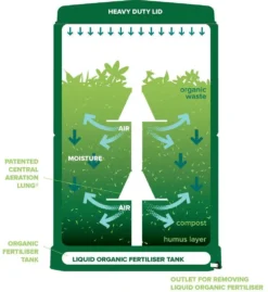 It’s dark colour helps absorb the suns heat while the air slots to help circulate fresh clean air and speed up the process of turning garden and kitchen waste into rich compost.
