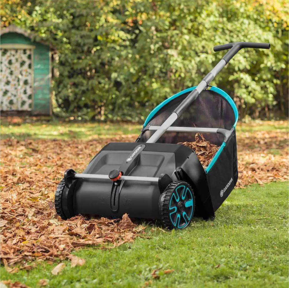 The GARDENA leaf and grass collector works like a mechanical rake and is therefore environmentally friendly. The rotating brushes are driven by the wheels. Solid objects such as acorns, chestnuts, fruit etc. are not collected. The leaf and grass collector is only partially suitable for foliage with stems and large leaves (e.g. chestnut) as these may get caught in the brushes. When collecting leaves on paved paths or tarmac, it may be necessary to go over the area multiple times.