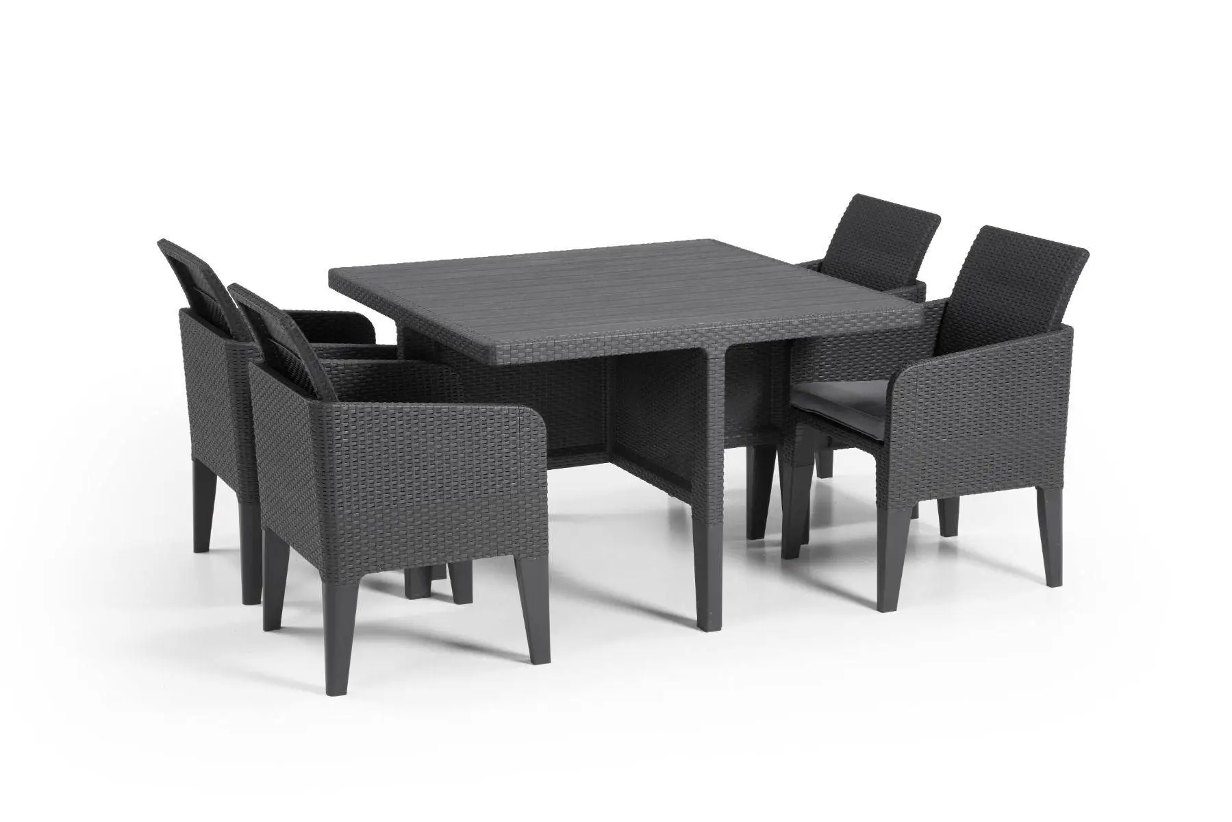 You’ll always be ready to enjoy good food with great company in the fresh outdoors, with this outdoor furniture set. Not only is the graphite wicker effect finish contemporary, but it is made from weather resistant, UV protected resin which will be durable through use after use. The resin is also formed to resist rusting, decay, or peeling, so you can rest assured your furniture will last well. Designed to be comfortable as well as practical, the cushioned seat pads and curved backrests on each of the chairs will allow you to properly relax. What’s more, the backrests have a folding capability, enabling them to slot into the table for space saving storage – ideal for smaller gardens.